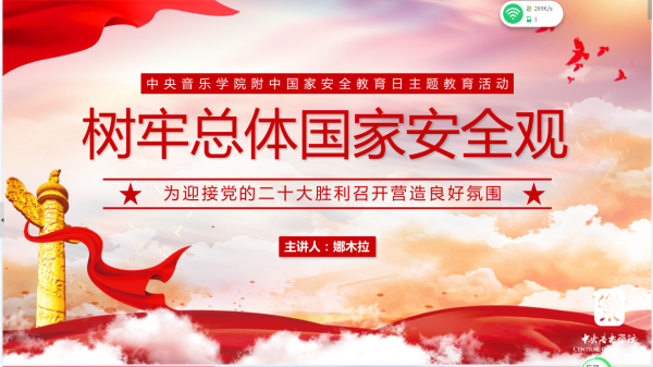 中央音乐学院附中坚持以习近平总书记关于国家安全的重要论述为指导,按照中央音乐学院俞峰校长提出的强调全院要重视和加大推进以“树牢总体国家安全观,感悟新时代国家安全成就”的要求,围绕“树牢总体国家安全观,感悟新时代国家安全成就”这一主题,宣传普及国家安全面贯彻国家安全观,以捍卫“两个确立”、树牢“四个意识”、坚定“四个自信”、做到“两个维护”把握安全教育的重要性,宣传普及国家安全法律法规知识,加强校园安全保障,增强师生国家安全意识。附中把安全工作作为学校重要工作,建立长效机制,抓紧抓实,警钟长鸣,为迎接党的二十大胜利召开营造良好氛围!