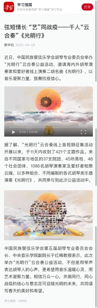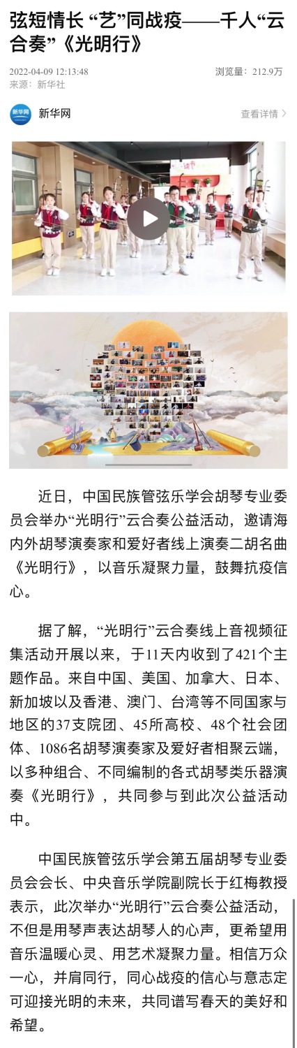 “光明行”云合奏线上音视频征集活动开展以来,短短11天汇集421件视频作品, 37支院团、45所高校、48个社会团体、1086名胡琴演奏家及爱好者汇聚云端,共同参与到《光明行》公益活动中。我校绝大部分在校胡琴专业师生和中央音乐学院民族室内乐团及广大校友都积极参与了此活动。活动获得了广泛关注,新华网、人民网、学习强国、央视文艺、文艺中国、北京日报、哔哩哔哩等各大新闻媒体和平台对此进行了报道,其中新华网4月9日仅发布6个小时便突破200万点击量。