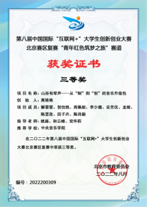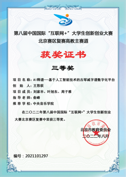在2022年第八届中国国际“互联网+”大学生创新创业大赛北京赛区中,我校参赛项目《AI释谱——基于人工智能技术的古琴减字谱数字化平台》与《MetaMusic—元宇宙音乐空间》分别获得高教主赛道三等奖,《“百年青春”党史学习教育系列剧本杀》与《山谷有琴声——从“制”到“创”的音乐升级包》分别获得“青年红色筑梦之旅”赛道三等奖。