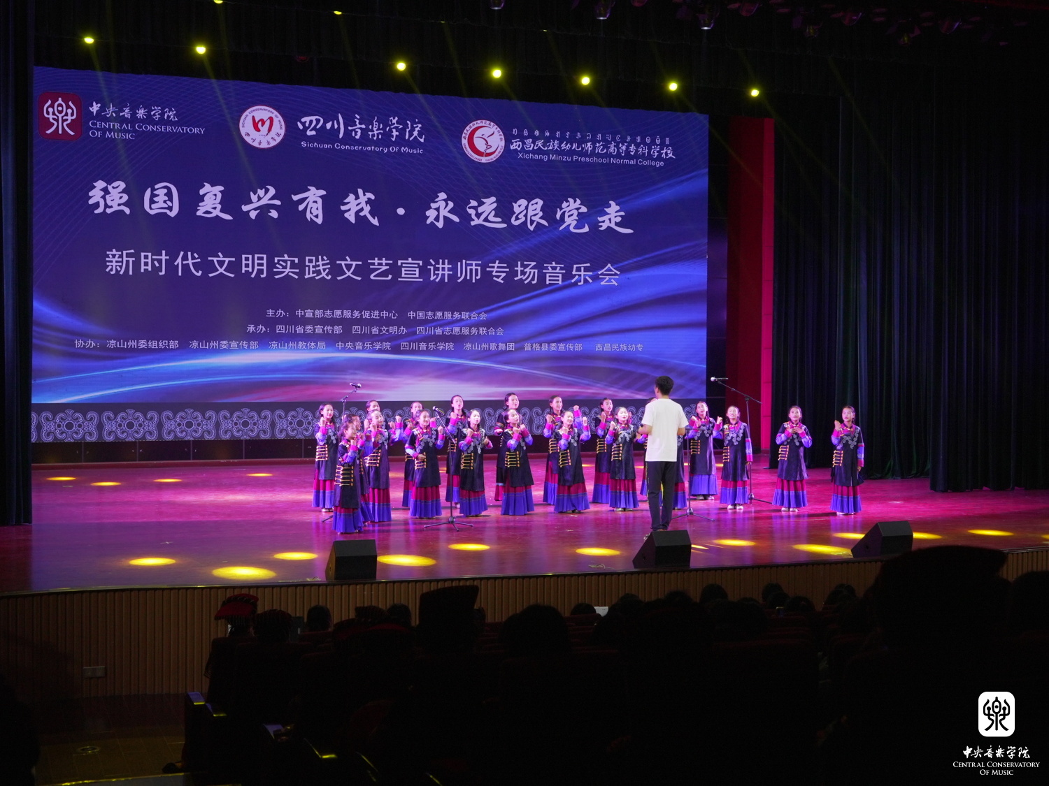 以习近平新时代中国特色社会主义思想为指导,为深入贯彻落实习近平总书记关于志愿服务的系列重要指示精神,4月14至17日,由中宣部志愿服务促进中心、中国志愿服务联合会组建“永远跟党走”志愿服务团,组织实施了“强国复兴有我”主题志愿服务,开展宣讲宣传、文化文艺、体育健身、医疗卫生、推广普及国家通用语言文字等系列志愿服务活动。此次,文艺志愿服务队由中央音乐学院牵头组织,选派了我校各专业优秀青年教师、集结派驻各地的文艺宣讲师,同时联合“全国高校文艺志愿服务联盟”中央美术学院、四川音乐学院师生共39人,组建成两支队伍,同时赴凉山州、宜宾市,通过开展师资培训、美育课堂、文艺宣讲、文艺展演等志愿服务活动,助力四川省美育教育发展,以实际行动助力少数民族地区文化建设。