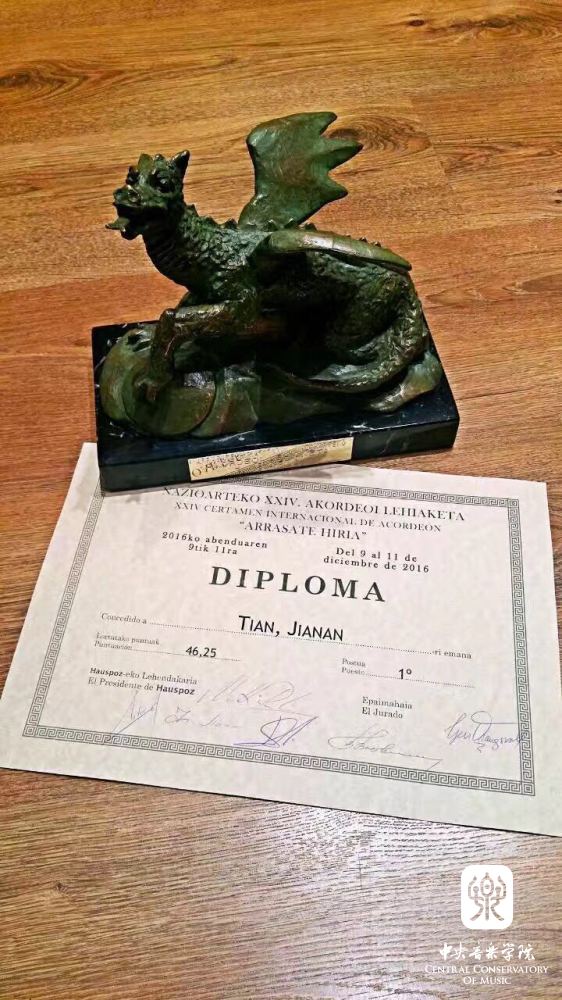 钢琴系手风琴专业田佳男(研究生一年级,指导教授:曹晓青)在西班牙“第24届阿拉萨特(International Accordion Competition Arrasate 8-11. 12.2016 )国际手风琴比赛中以出色的表现赢得比赛第一名。