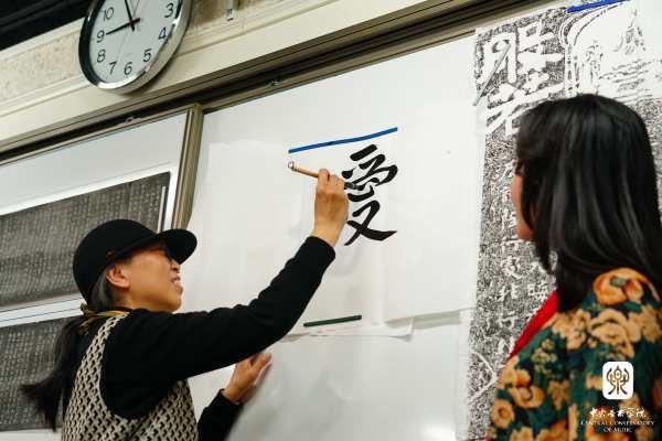 在介绍了相关背景知识后,苏荷艳老师亲自示范书写了“福”字,让印尼教师们模仿、学习。随后,苏荷艳教师又教大家学写了相对较难的“爱”字。