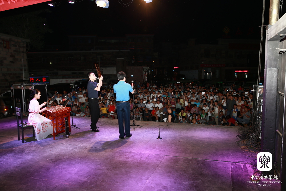 演出20:30正式开始。来观看的观众或坐或站挤满了广场,有坐着轮椅或者拄着拐棍的老年人,领着才会走路的小孙子的老奶奶,还有抱着孩子的母亲, 正当壮年辛勤劳作的朴实山民……。为了适应广场文艺演出的条件和氛围,演奏家们调整了个别曲目,如孙媛媛老师演唱了通俗歌曲《你的眼神》,刘霄老师加演了《庆丰收》。孙媛媛老师的主持风趣而大方,使得现场气氛非常活跃。这些经常在国家大剧院、北京音乐厅甚至国际顶级音乐厅演出的一流演奏家们,第一次站在这样简陋而又奇妙的乡村大篷车上为山里的老乡演出,也是抑制不住兴奋,演奏演唱发挥出了超常的状态。异彩纷呈的音乐和投入的表演深深感染了老乡们,优美的乐声穿透深深的夜色,回荡在群山之中。有个年轻的妈妈说:“这么高水平高级别的音乐会,真想不到来我们这里演出,太兴奋了,回去怎么睡得着觉呢?”当地干部说“中央音乐学院这么高大上的学校来我们这里举办音乐会,这是第一次”。