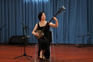 7月11日下午在土默特左旗文化馆大楼,与土默特左旗乌兰牧骑交流演出,这是此行的重点活动之一。中央音乐学院青年教师与土默特左旗乌兰牧骑进行了联谊演出。土左旗乌兰牧骑演出了开场歌舞《吉祥土默特》,男声独唱《天堂》(朝格吉勒图演唱),原生态组合《苏力德》(扎木契组合),女声独唱《永远的丰碑》(塔娜演唱)、群舞《丰收》(李吉等),二重唱《寻梦》(额尔敦苏和、巴达玛其木格演唱),马头琴齐奏《黑木日》(阿木古楞等),群舞《万马奔腾》(阿丽玛等)。中央音乐学院青年教师表演了三弦独奏《沙漠之旅》(张柳萌独奏),小提琴二重奏《双小提琴协奏曲》(小提琴:徐莹、何畅,钢琴:马晓鸥),琵琶独奏《春雨》(江洋独奏)。王颖(二胡)、智圆行方(钢琴)两位老师和温都苏(马头琴)即兴合奏了《鸿雁》。扎根草原、服务牧民的工作目的,造就了乌兰牧骑艺术家一专多能的优长,他们拿起话筒就是歌唱家,穿上舞蹈服就是舞蹈家,操起马头琴就是演奏家,自如的在歌、舞、乐之间自由的转换角色,体现了高超的艺术才华。丰富多彩的节目交流,艺术家们获益匪浅,意犹未尽,抓紧分秒时间在琴房更进一步交流。