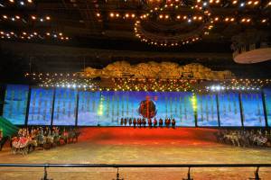 11日晚,实践团在内蒙古少数民族群众文化体育运动中心观摩了内蒙古民族艺术剧院倾力打造的中国首创全景式大型马舞剧《千古马颂》(2019版)。演出将马术、杂技、蒙古族歌、舞、乐等艺术元素,融合声光电、裸眼3D等现代视听技术,蓝天、白云、草原、风雨雪、诗歌、音乐、爱情、婚礼、赛马、战争……以草原文化中最典型的元素“马”为核心,全方位展示了草原文化,歌颂了马背民族坚韧不拔的民族精神,展示了人、马、草原和谐共生的大美境界,场面恢弘、美轮美奂,带给人极强的精神震撼。