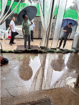 面对严峻的防汛形势,后勤团队迅速响应,全面启动汛情隐患排查与处置工作。团队成员深入校园各个角落,对排水管网、屋顶防水、墙体结构等进行细致检查,及时处理各类潜在风险。目前,学生公寓外墙石材一期维护抢修工作已顺利完成,有效提升了建筑在雷雨天气下的安全性能;针对琴房楼 B1 层渗水问题,及时组织抽水作业,保障地下空间干燥;歌剧音乐厅一层强电井出现漏雨后,第一时间安排物业对配电箱进行防护,避免电器设备受损。