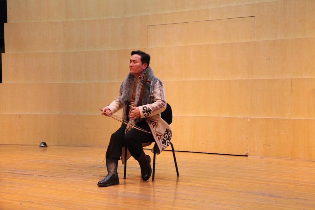 冬不拉是哈萨克族最具代表性的乐器,既可独奏,也可以用来伴唱歌曲、曲艺。展演以经典冬不拉独奏曲《马奶曲》与《棕色的麋鹿》开场,勾勒出游牧民族的生活图景。铁尔麦和阿肯弹唱都是哈萨克族的传统曲艺形式,用冬不拉自弹自唱,讲述民族历史、揭示生活哲理。阿肯弹唱需要即兴智慧,当晚的表演者加米哈便即兴填词,弹唱了来到中央音乐学院演出的所见所感。观众虽然听不懂哈萨克语,却被其顿挫而富有韵律的诵唱感染,现场不时响起热烈的掌声。