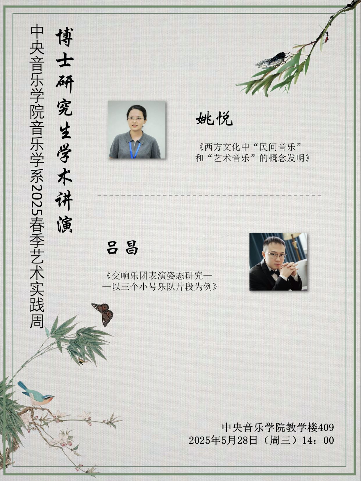 当学术的光芒遇见思想的舞台,一场音乐学的盛宴即将启幕!2025年5月28日14:00,中央音乐学院音乐学系将迎来一场别开生面的博士研究生学术演讲会。作为2025春季艺术实践周的组成部分,两位二年级博士研究生将化身学术先锋,带着他们在各自领域深耕细作的最新研究成果登上舞台。此次演讲仍将采取TED演讲的模式,让我们共同踏上音乐学前沿问题的探索之旅!