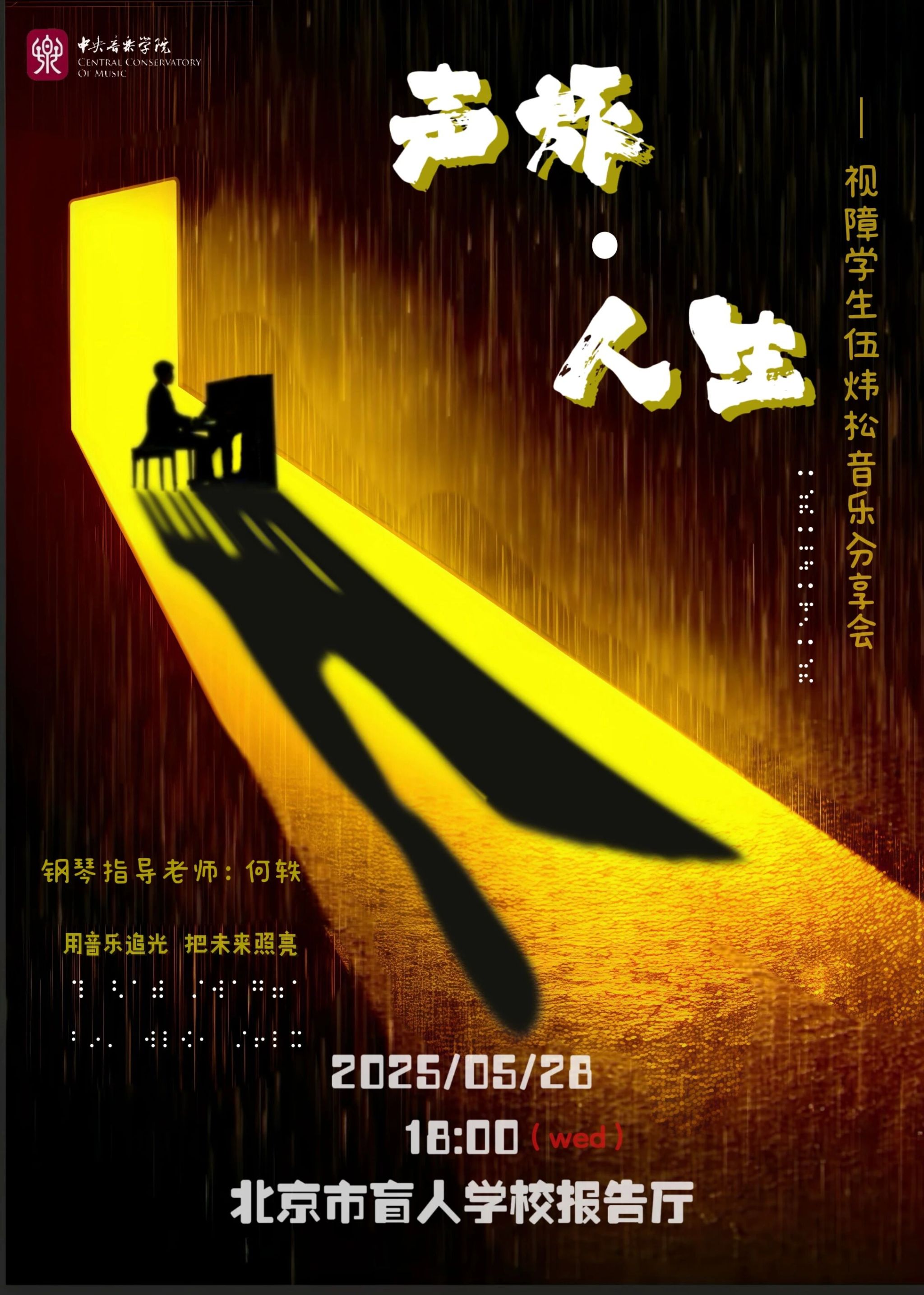 5月28日18:00,我校作曲系学生伍炜松带着充满力量与感动的音乐成长故事,走进了北京市盲人学校,为师生们带来了一场别开生面的“声旅人生”音乐分享会。