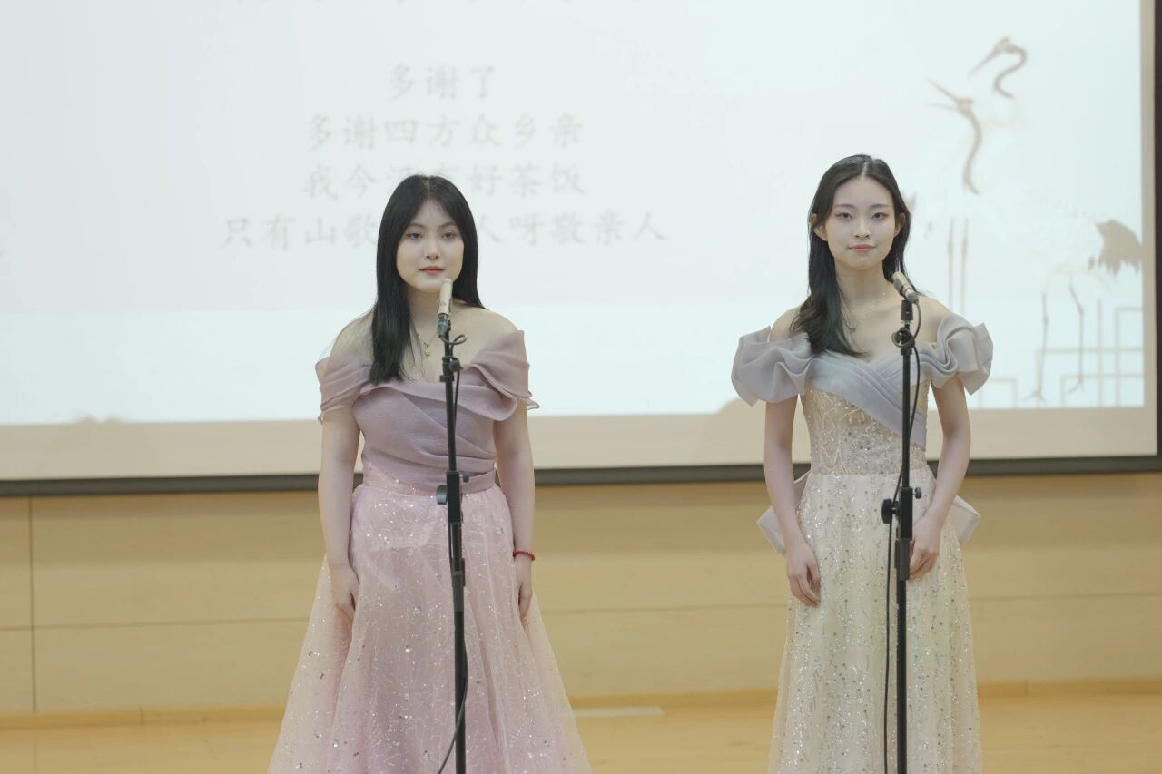 杨心瑶与彭昱深情献唱了广西经典民歌《山歌好比春江水·多谢了》。在梁泳岚如潺潺春水般流淌的钢琴伴奏烘托下,悠扬婉转的歌声仿佛将八桂大地的灵秀山水搬上了舞台。这首歌的歌词本身就蕴含着真挚的感恩之情,表演者精准地捕捉并传递了这份情感,使其超越地域界限,成为对所有幕后支持者与现场观众最温暖的致谢。 选择这首融合了地域特色与普世情感的民歌作为尾声,不仅是对整场多元文化交流的呼应,更是学子们将音乐作为情感纽带、回馈师友的生动实践。悠扬的山歌在音乐厅回荡,为这场充满人情味与青春活力的艺术盛宴画上了一个温情而圆满的句点。