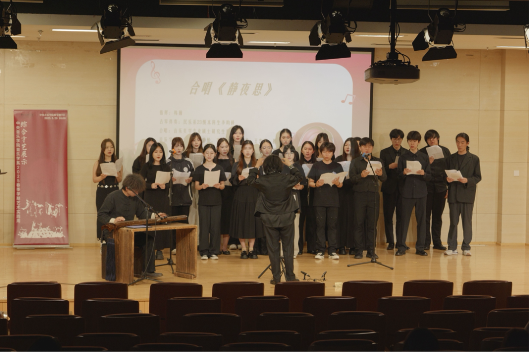 “不知乘月几人归,落月摇情满江树。”整场演出以我系褚历教授谱曲、由2024级音乐学系以及来自民乐系、音乐教育系的的同学们共同演绎的一曲《静夜思》收束。在“举头望明月,低头思故乡”的反复咏叹中,声声吟哦,宛如海上明月空灵而动人;阵阵拂弦,仿佛松间寒涧清冽而沉邃,使观众们体悟诗人的幽思与惆怅,共沐浴于东方美学的魅力中,直至歌声绕梁。