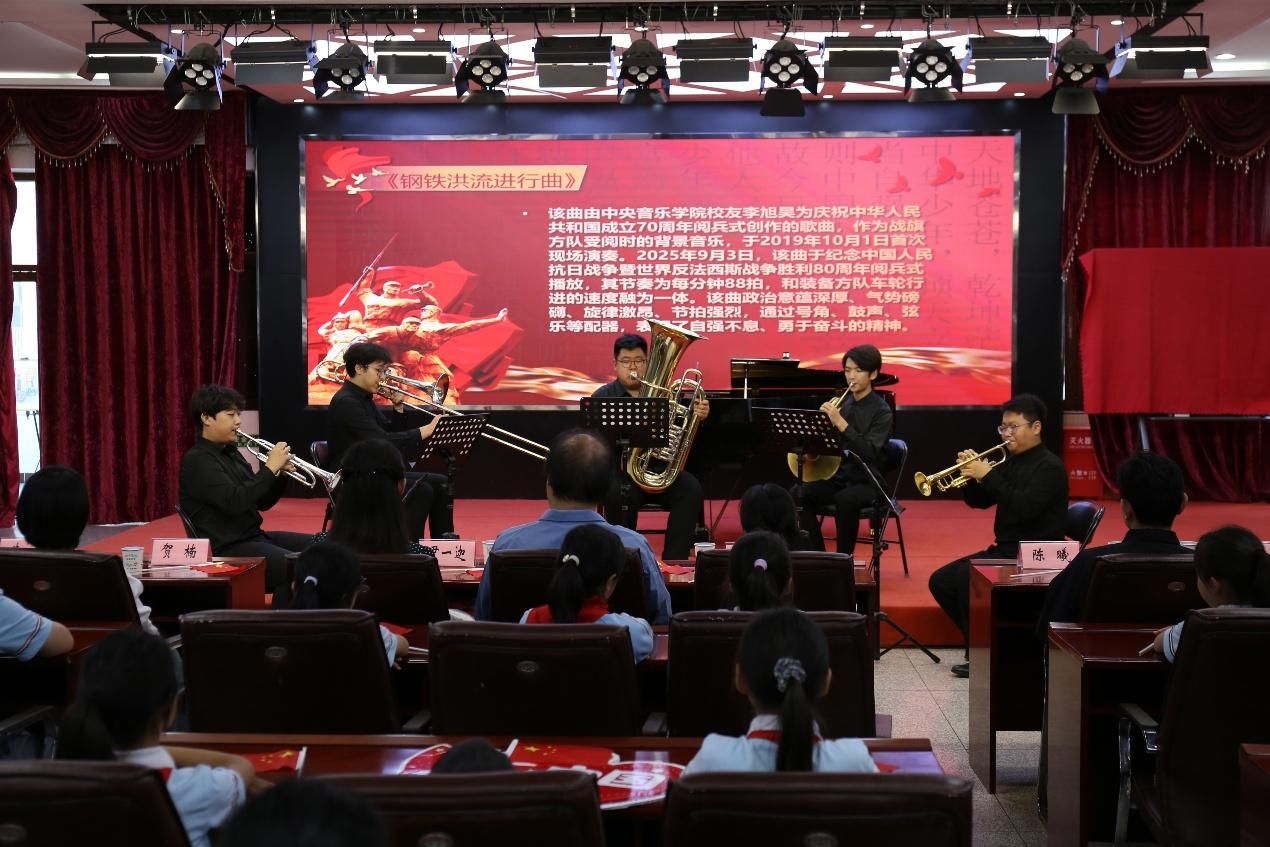 尹一迦进一步对演出曲目进行介绍并表示,希望今天的音乐思政课,不仅是一次艺术的欣赏,更是一堂生动的爱国主义教育课。她勉励同学们在音乐中感受家国情怀,把红色精神化为奋发向上的动力,用实际行动努力成为新时代有担当、有理想的少年。