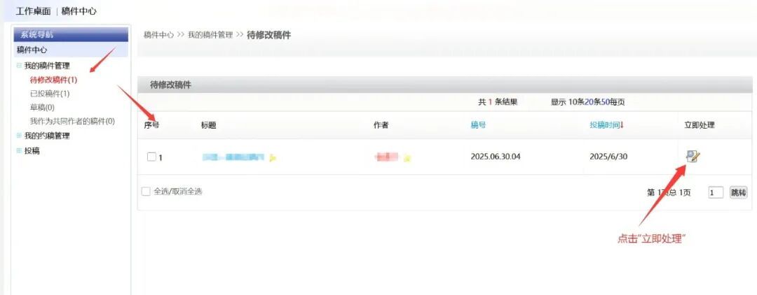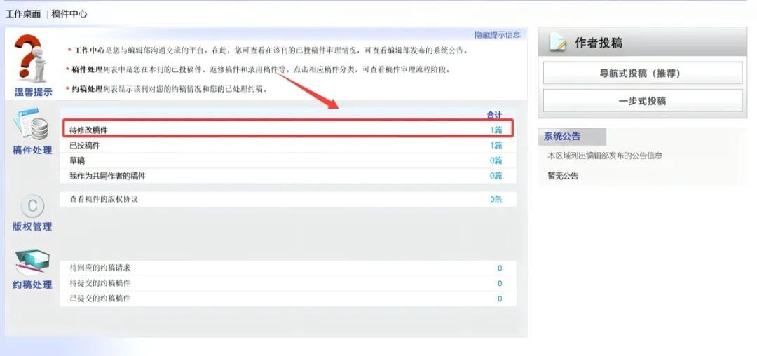 在【待修改稿件】分组中,作者可根据页面提示上传修改稿及相关信息。修改稿上传完成后,点击提交。