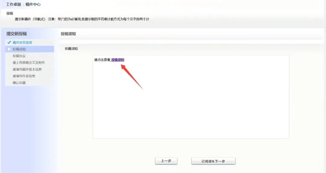 点击进入投稿,选择稿件类型后,就可以基于编辑部预设的投稿步骤和操作提示,逐步完成投稿。